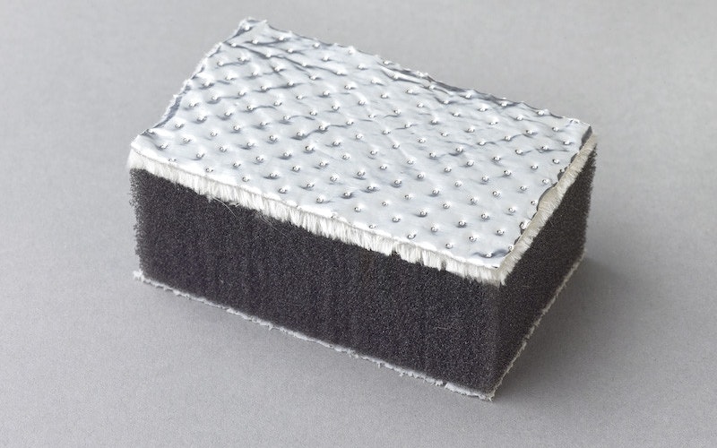 M 1724 is a glass fibre mat (thickness approx. 3 mm), on one side lined with a perforated aluminium foil (thickness approx. 0.09 mm, hole diameter 1.5 mm, hole content approx. 7%), laminated on a polyurethane-foam (polyester), bonded on a composite of two glass fibre mats (thickness, each approx. 7 mm) and an intermediate heavy foil based on bitumen. Self-adhesive equipment with a high-quality adhesive system based on acrylate.