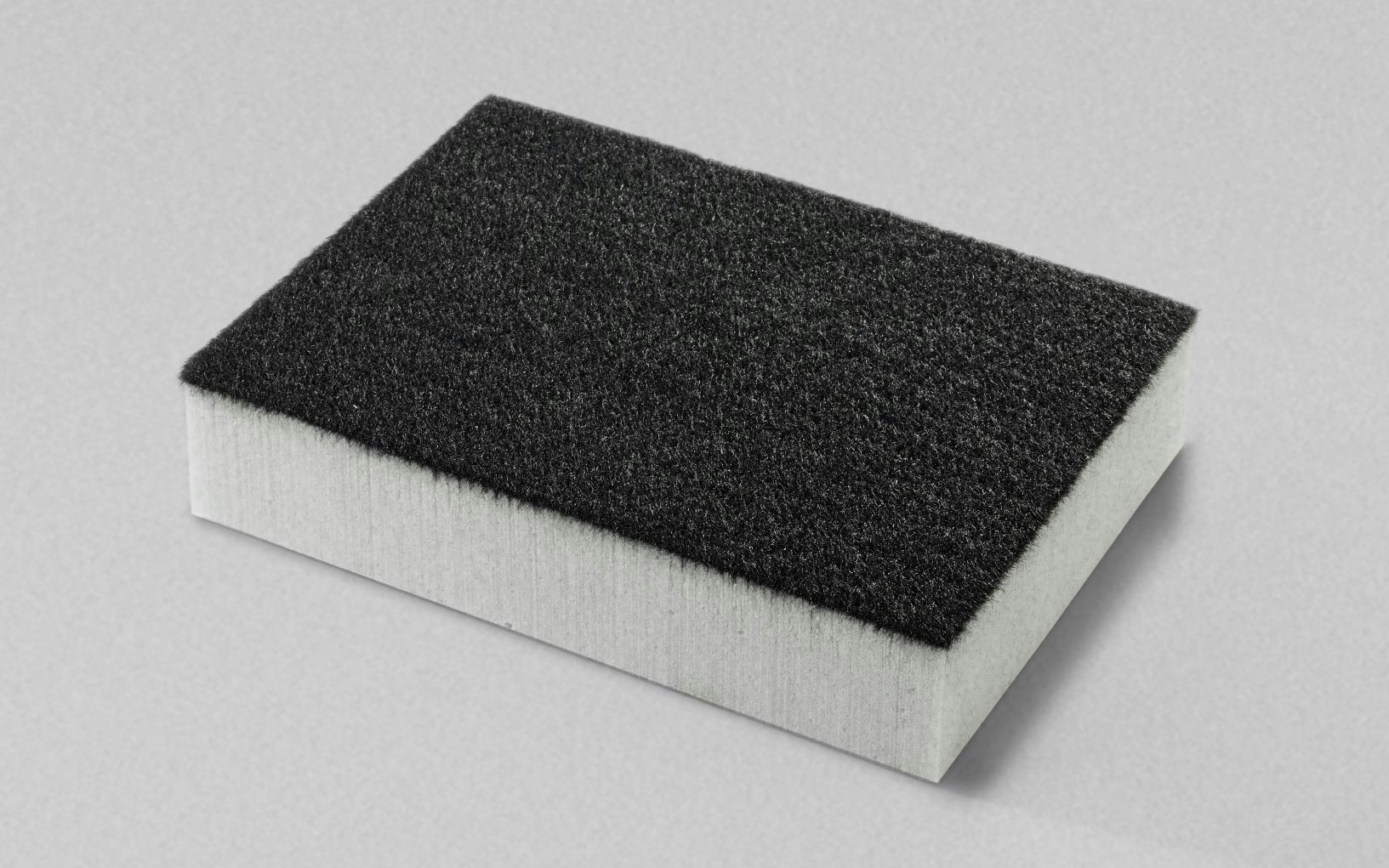 Ein Weichschaumstoff auf Basis von Melaminharz, kaschiert mit einem Carbonfaservlies, welches mit einer Rautenprägung versehen ist.
